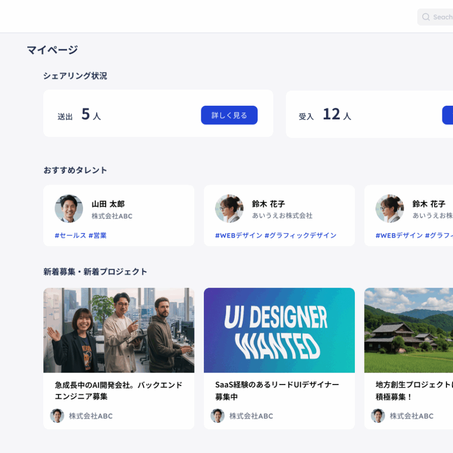 即戦力タレントのシェアや募集案件の検索が可能です。