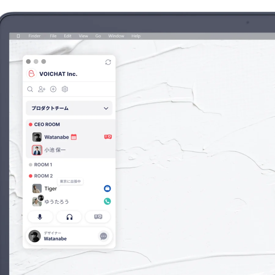 バーチャルオフィスSaaS「VOICHATオフィス」と連動した安心の業務環境。チャットや資料共有などリモートワークに必要な機能の提供に加えて、勤怠管理や行動ログ、IPアドレス制限などのコンプライアンス強化機能も標準装備しています。